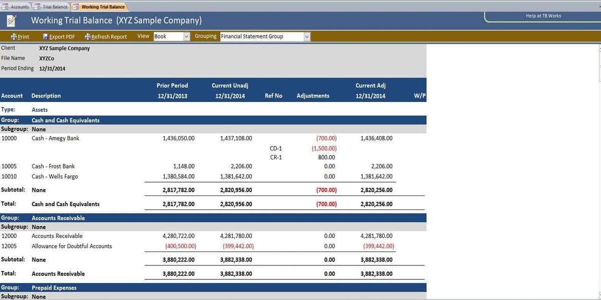 EZ Trial Balance Software is your basic affordable trial balance software to get your job done! Upload or enter your client's trial balance from Excel; assign types and subtypes, groups and subgroups; record adjusting, reclassifying, and potential journal entries; record cash disbursements and cash receipts; book, cash, tax, state, and other basis of accounting; general ledger; grouped working trial balance; analytical and many more reports!
